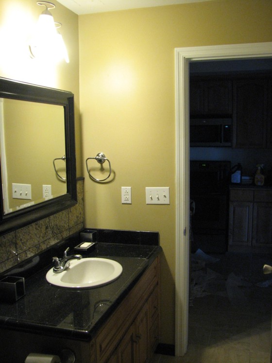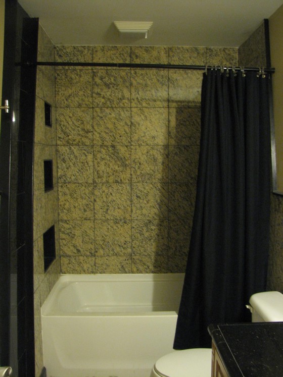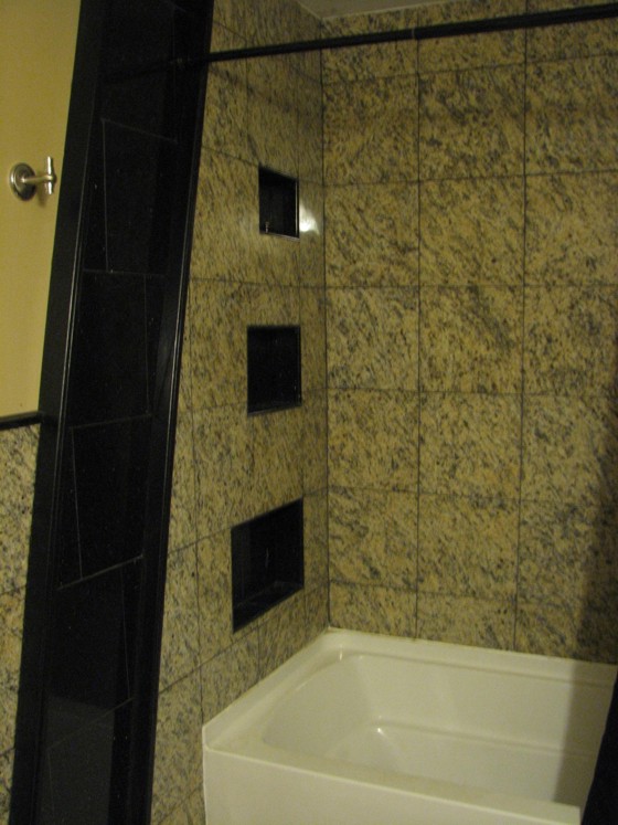 The bathroom project included granite tile and a granite-tiled countertop. It required moving the contractor-installed plumbing from the south side of the wet wall to the north side.